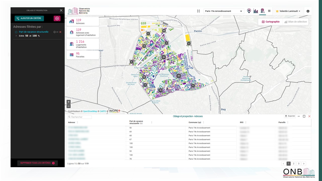 Exemple de recherche grâce à l’outil de ciblage et de prospection : ici on se concentre sur les adresses pour lesquelles au moins 50% des logements est identifié comme vacant.