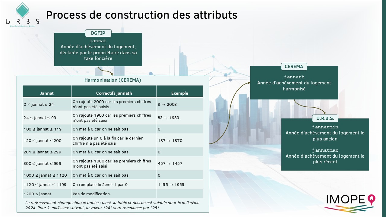 Les attributs que nous proposons dans la base IMOPE et dans nos outils se basent sur la variable jannath présente dans les Fichiers Fonciers fournies par le Cerema. Cet attribut représente une année de construction harmonisée et permet de pallier les inexactitudes de déclarations ou d’enregistrement dans la taxe foncière. Néanmoins, les constructions anciennes peuvent avoir une année de construction peu fiable. Dans notre process, nous ne tenons compte que des années strictement supérieure à 0.