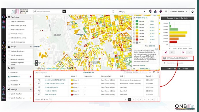 La table attributaire, regroupe l’ensemble des informations liées à l’attribut actif pour chacune des entités visibles sur la carte (adresse, valeur de l’attribut, nombre de logements, parcelle, IRIS, commune).