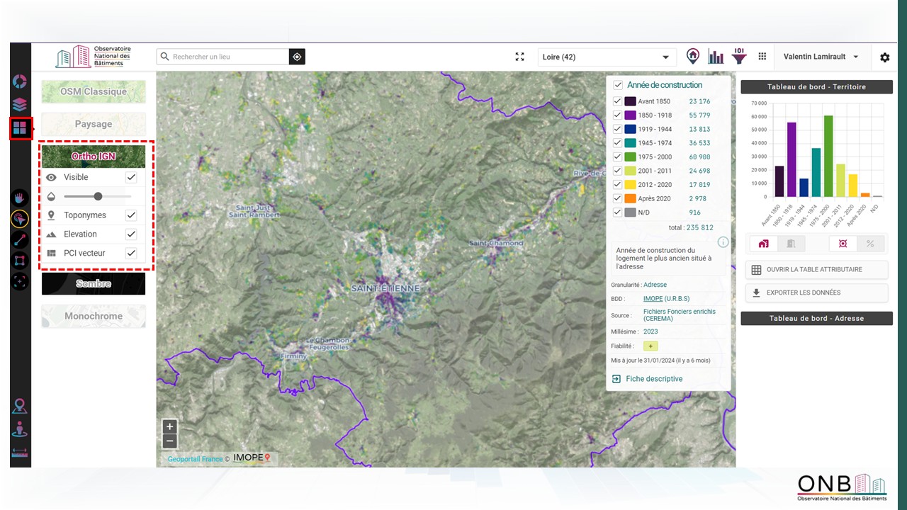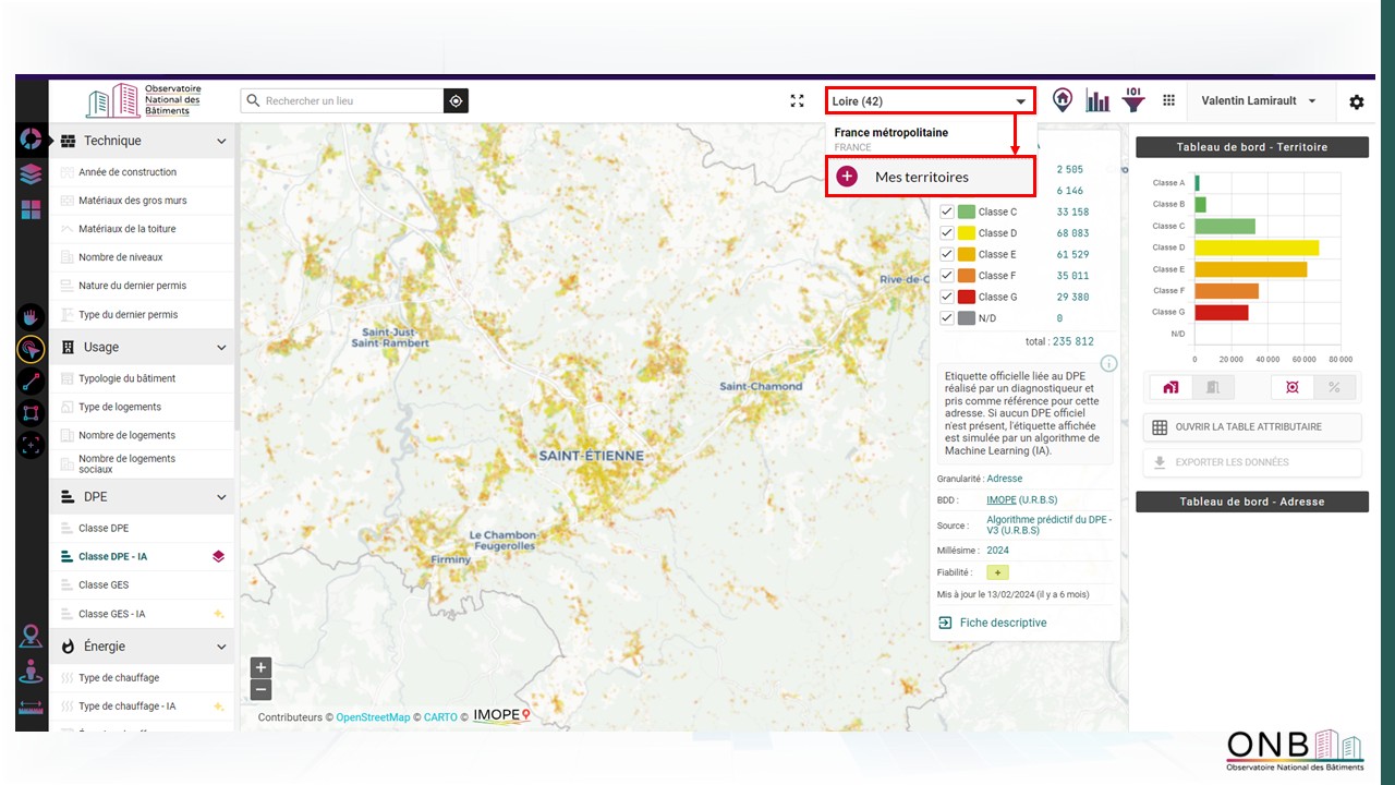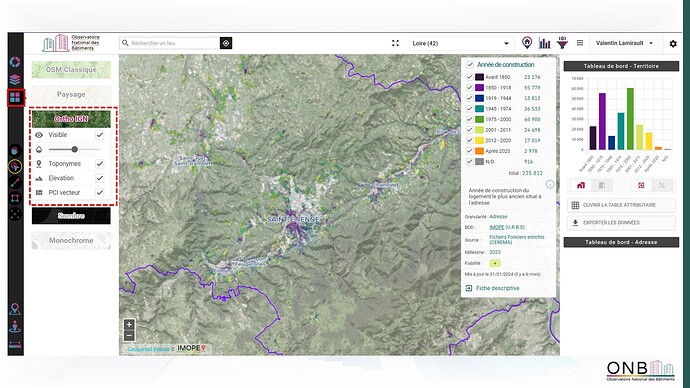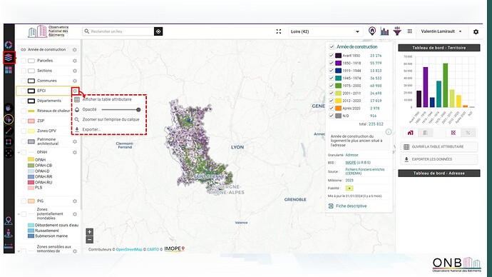 Pour aller plus loin dans le repérage de bâtiments homogènes, il est possible d’utiliser des l’outil de ciblage et de prospection afin de croiser les données attributaires (disponible dans l’ONB+ et l’ONB+ Territoire). Cette fonctionnalité permet d’identifier en quelques secondes les bâtiments répondant à des critères choisis, que vous pouvez définir en toute autonomie. Un résultat de la sélection permet également de caractériser rapidement les caractéristiques du gisement identifié. Les gabarits des sélections peuvent être alors chargés et sauvegardés.