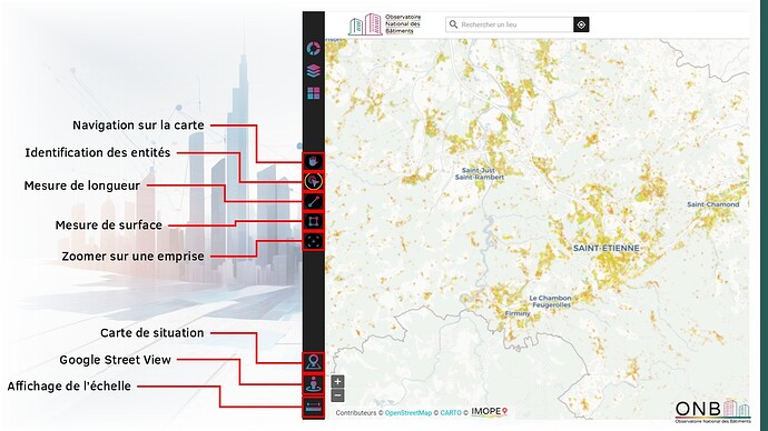 Plusieurs outils sont à votre disposition dans les différentes versions de l’ONB. Certains servent à interagir avec la donnée et permettent de naviguer sur la carte , d’autres d’identifier une entité ou encore de mesurer une longueur , une surface ou enfin de zoomer sur une emprise .