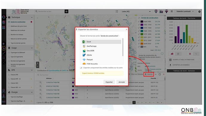 Dans l’ONB et l’ONB+, l’export est limité à 10 000 entités et n’est pas possible pour les données prédites par U.R.B.S (Classe DPE IA, classe GES IA, Type de chauffage IA, Energie chauffage IA, Prix de ventre au m² IA, Ecart au prix du marché).
