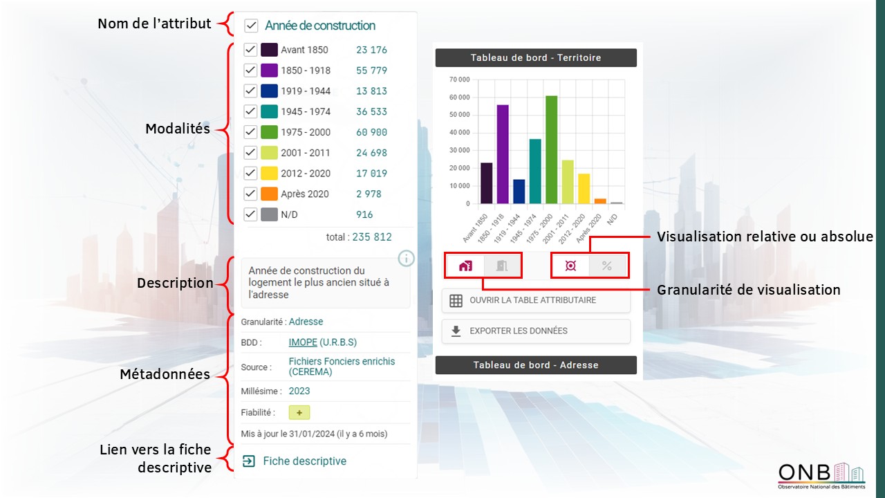 En plus d’être représentés sur la cartographie, l’attribut et ses modalités sont visibles sur un graphique synthétique à l’échelle du territoire, en unités ou en pourcentage, au logement ou à l’adresse. Vous pouvez donc les observer sous différents angles.