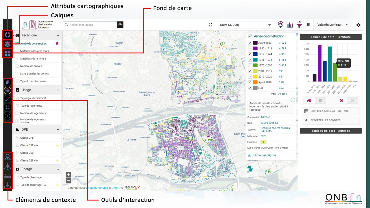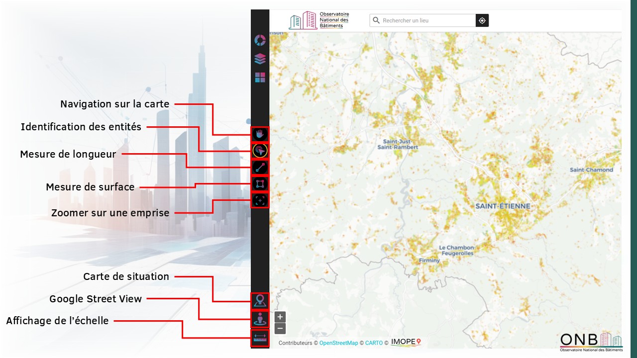 Plusieurs outils sont mis à votre disposition pour faciliter la prise en main de la donnée. Ces outils comprennent des fonds de carte, des outils d’interaction et des éléments de contexte .