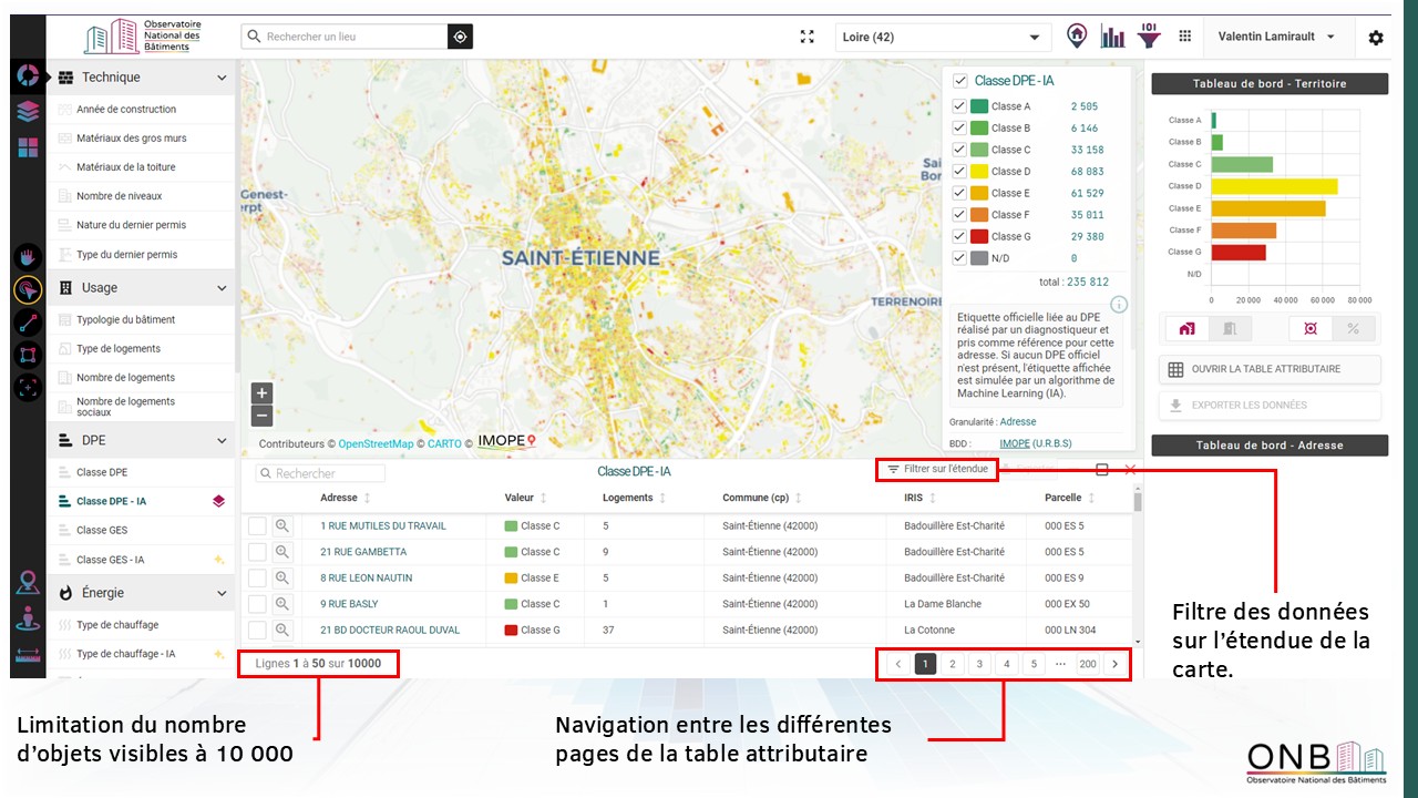 Les données de la table attributaire sont paginées et limitées à 10 000 objets . Dans le cas où il y aurait plus de 10 000 objets sur le périmètre, les données proposées dans la table attributaire seront présentées de manière aléatoire. Par exemple, si 20 000 objets sont présents sur le territoire, 10 000 seront sélectionnés aléatoirement dans la table attributaire. Il est donc conseillé de travailler sur une étendue réduite pour avoir, dans la table attributaire, des données exhaustives qui prennent en compte l’ensemble des informations sur un périmètre.
