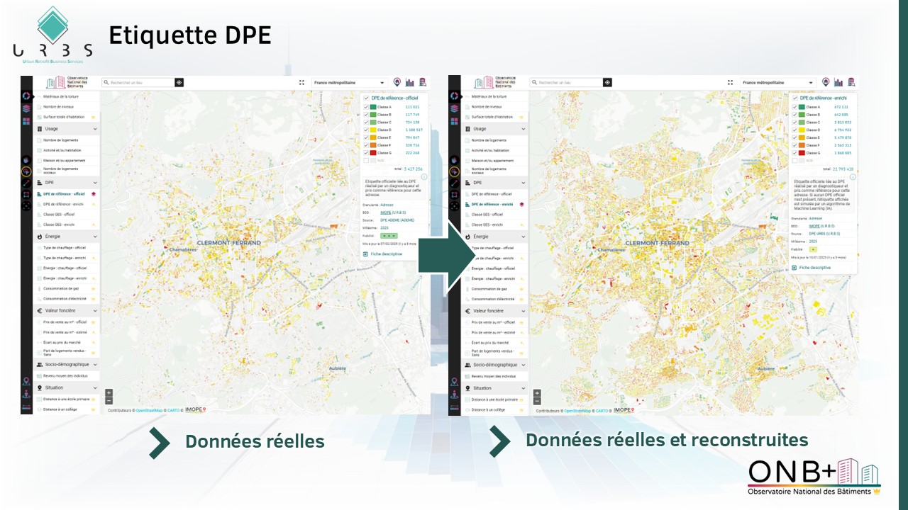 Les données réelles relatives aux DPE sont disponibles gratuitement pour tous dans l’ONB. Les données prédites ainsi que l’historique des DPE nécessitent une licence. Le DPE de référence est disponible dans l’ONB dans tous les outils : cartographie, tableaux de bord et outil de ciblage et de prospection.