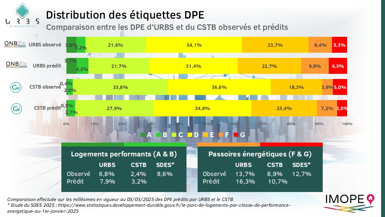 En particulier, les distributions obtenues par URBS sur les DPE observés des logements performants (étiquettes A & B) et des passoires énergétique (étiquettes F & G) sont plus proches des observations réalisées par le SDES début 2025 dans son étude des performances énergétiques du parc de logement.