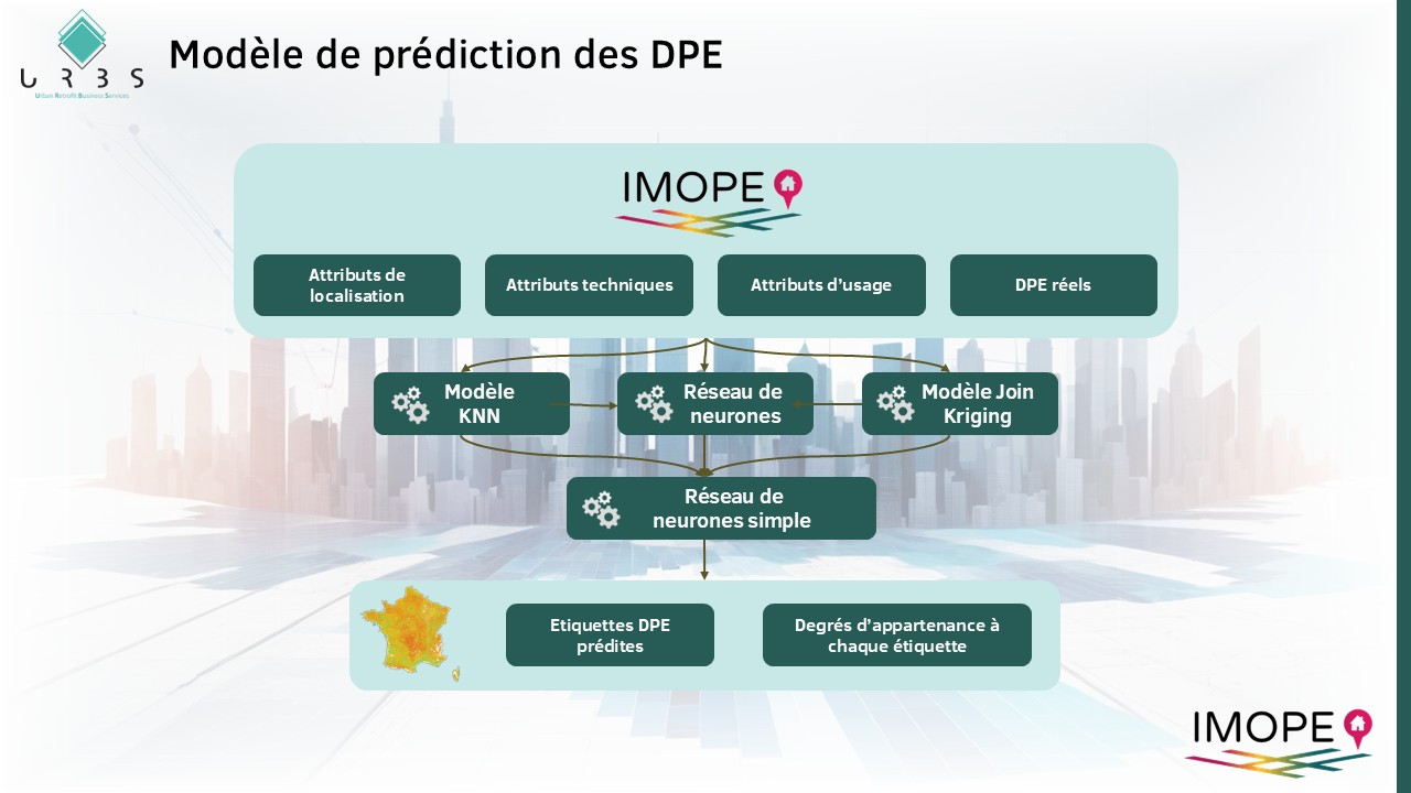 - les modèles statistiques, modèle que l’on met en œuvre chez U.R.B.S., dans lequel on se base sur des algorithmes d’intelligence artificielle afin d’établir des liens statistiques entre les informations connus sur le bâtiment et son DPE. Dans ce type de modèle on valorise tout type d’information : aussi bien des informations techniques que géographique ou sociologique. Les attributs de la base IMOPE sont ici pleinement mobilisés. Dans ce type de modèle, il n’y a pas de données à estimer. L’inconvénient de ce type de modèle est que la simulation de scénario est difficile et qu’il nécessite un grand échantillon d’apprentissage. Cependant, la base des DPE réels étant suffisamment grande, cette dernière limite n’en est pas vraiment une.