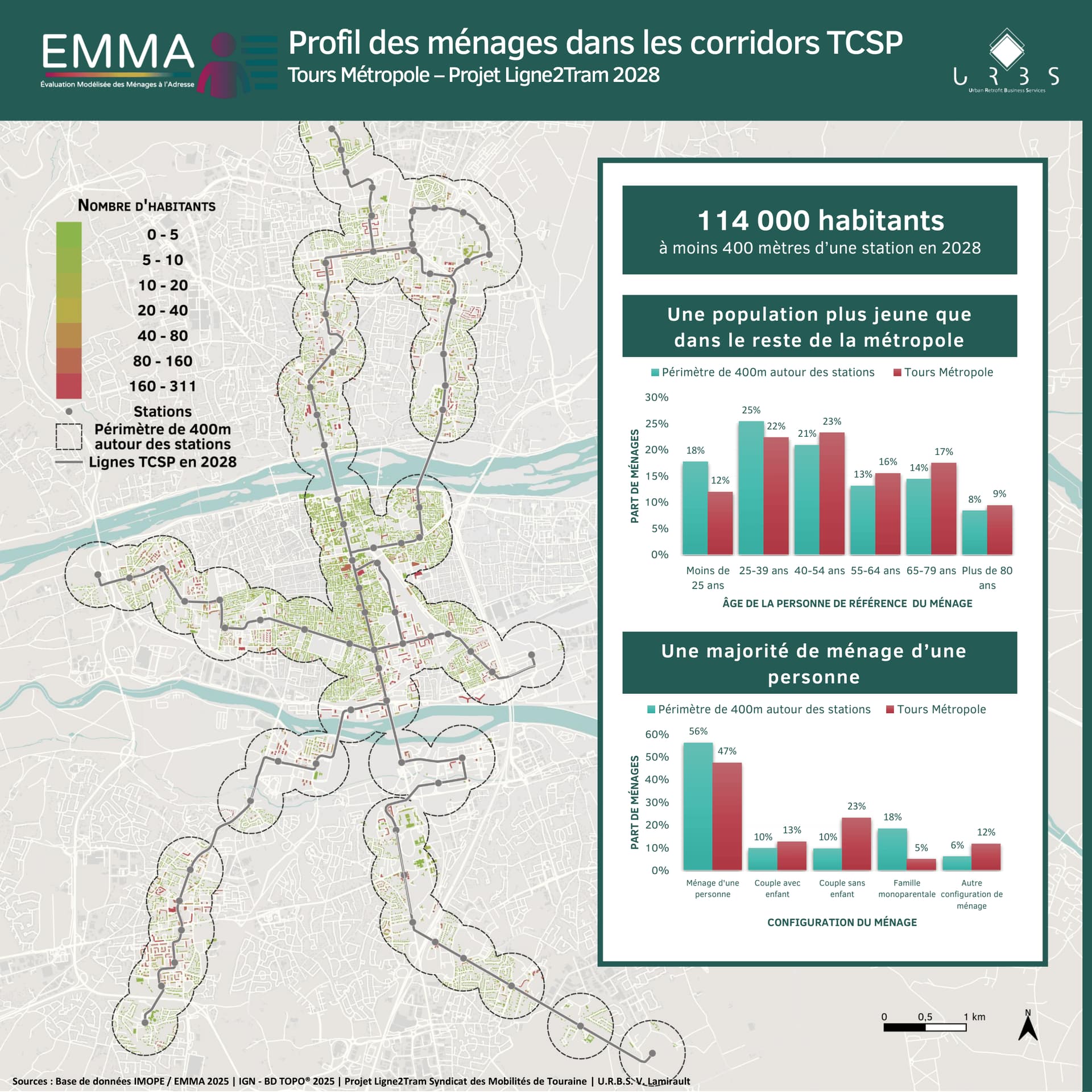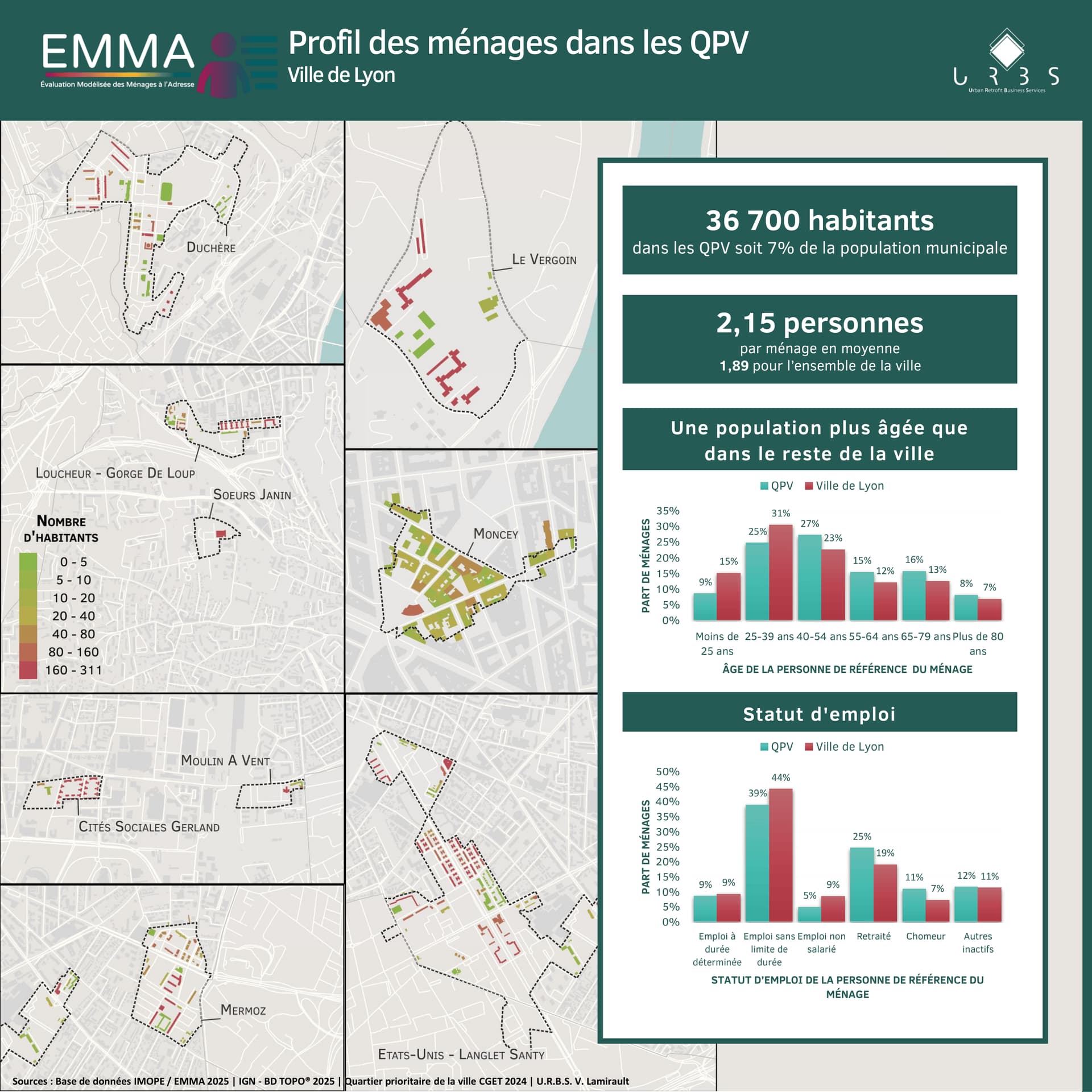 Les données socio-économiques EMMA prédites par U.R.B.S. Pour chaque adresse « logement » du territoire, un profil socio-économique représentant les caractéristiques des ménages est attribué. La base EMMA permet une descente d’échelle à l’adresse inégalée pour une finesse dans l’analyse des profils des habitants.