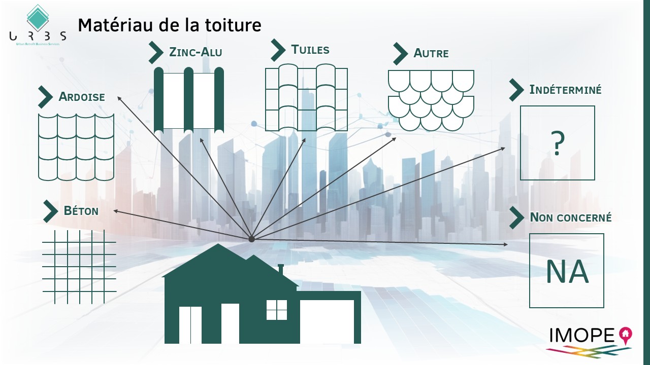 La figure ci-dessous explicite les différents matériaux retenus dans IMOPE. Pour chaque adresse, le matériaux majoritaires (en nombre de logements) est conservé parmi : Tuiles, Ardoises, Zinc, Béton, Autre, Indéterminé.