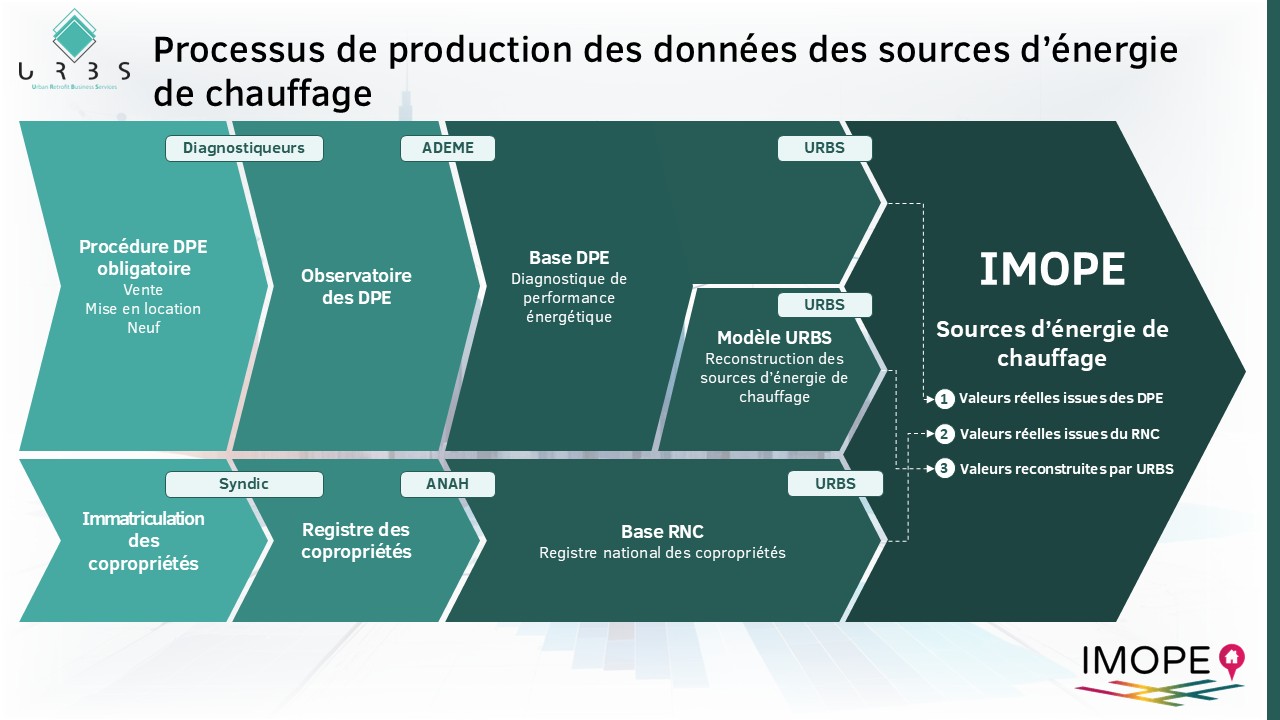 La source d’énergie du chauffage est référencée dans la base de données des DPE de l’ADEME (données en open data). Si des sources d’énergie de chauffage différentes sont déclarées dans les DPE, nous conservons celle ayant la plus grande consommation d’énergie primaire. À noter que ces sources d’énergie peuvent avoir fait l’objet d’un retraitement si des incohérences sont identifiées au sein d’un même diagnostic. Si aucun DPE n’a été réalisé, l’information peut-être issue du registre national d’immatriculation des copropriétés (RNIC).