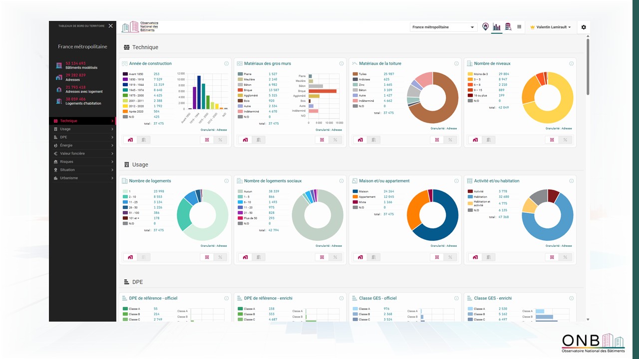 Le tableau de bord territoire vous permet d’avoir un aperçu statistique des données à l’échelle d’un territoire donné (France Métropolitaine par défaut, Département, EPCI, commune ou arrondissement que vous auriez configuré). Les attributs sont disponibles à l’échelle de l’adresse ou du logement et sont exprimés en unités ou en pourcentages.