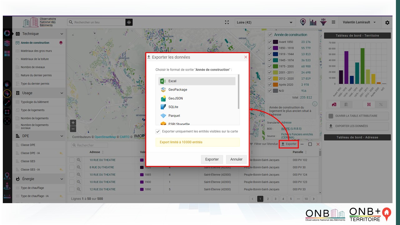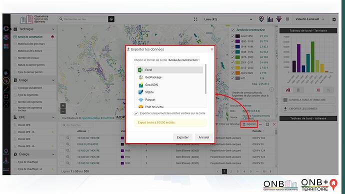 L’ONB, l’ONB+ et l’ONB+ Territoire ont été conçus pour permettre de réutiliser les données mise à disposition : table attributaire, tableau de bord du territoire, tableau de bord à l’adresse ou encore résultat d’un scénario du filtre multicritère. Tous ces éléments sont exportables et peuvent ensuite être réutilisés. Tour d’horizon.